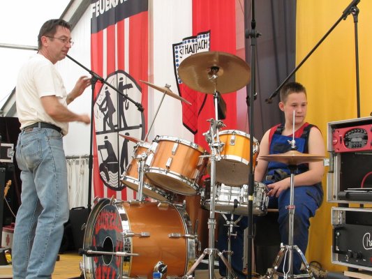 Hey! Der Ersatz-Schlagzeuger stellt seine Instrumente ein (Chef guckt zu).